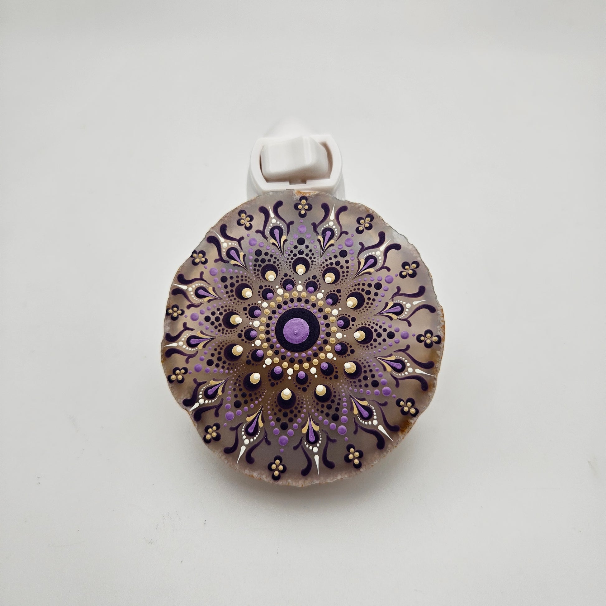 Transform a dark space into something beautiful with the Agate Mandala Nightlight. This natural agate painted to create an elegant and calming ambience, perfect for bedrooms, hallways or anywhere else you need extra light. Powered by an ON/OFF switch.