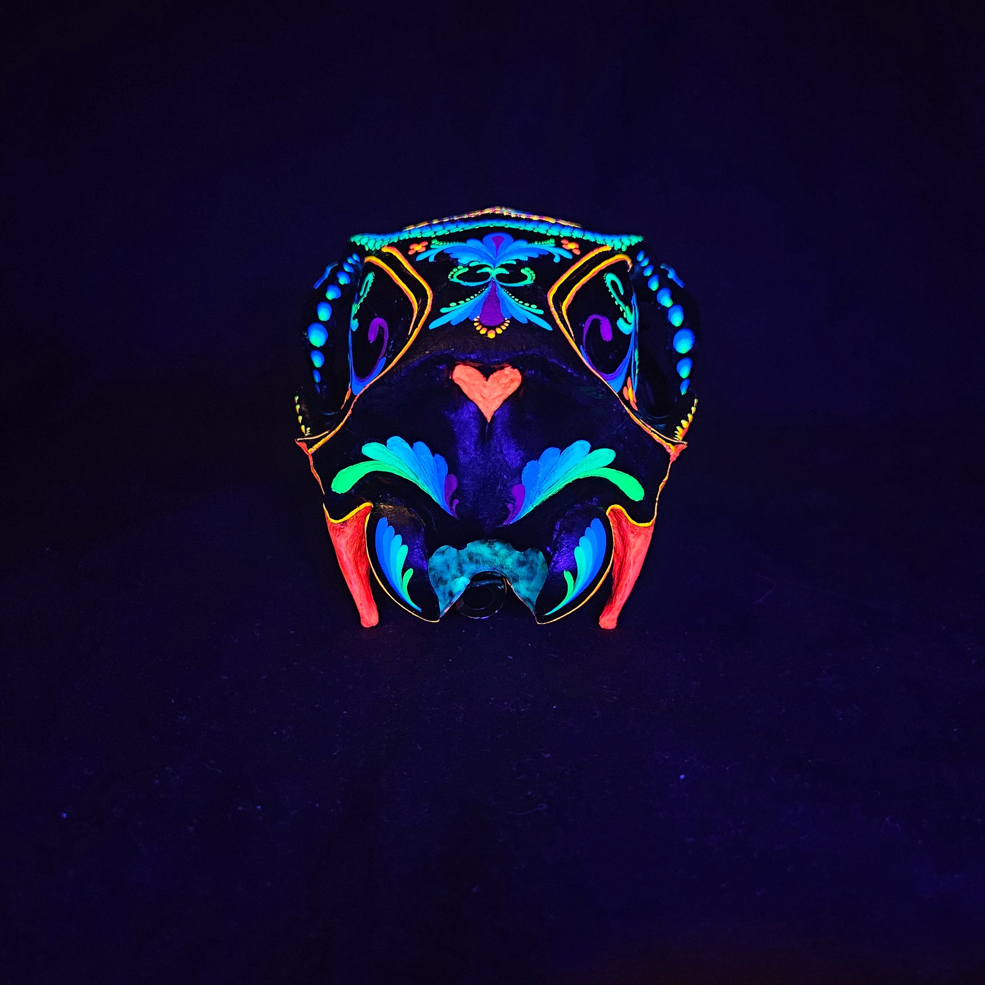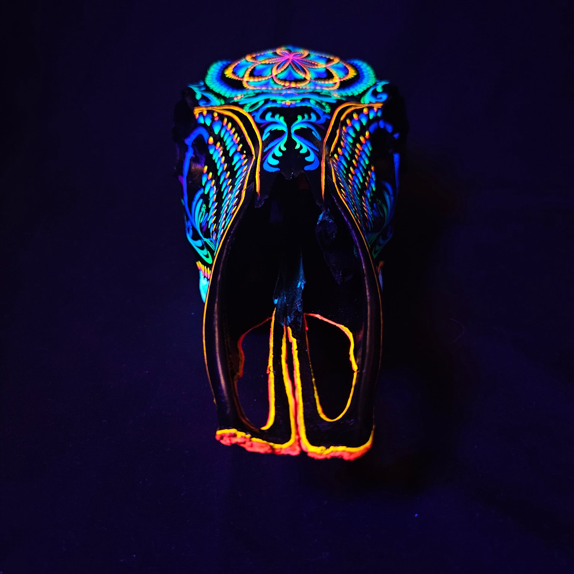Materials: Authentic female elk skull, UV-reactive & glow in the dark acrylics