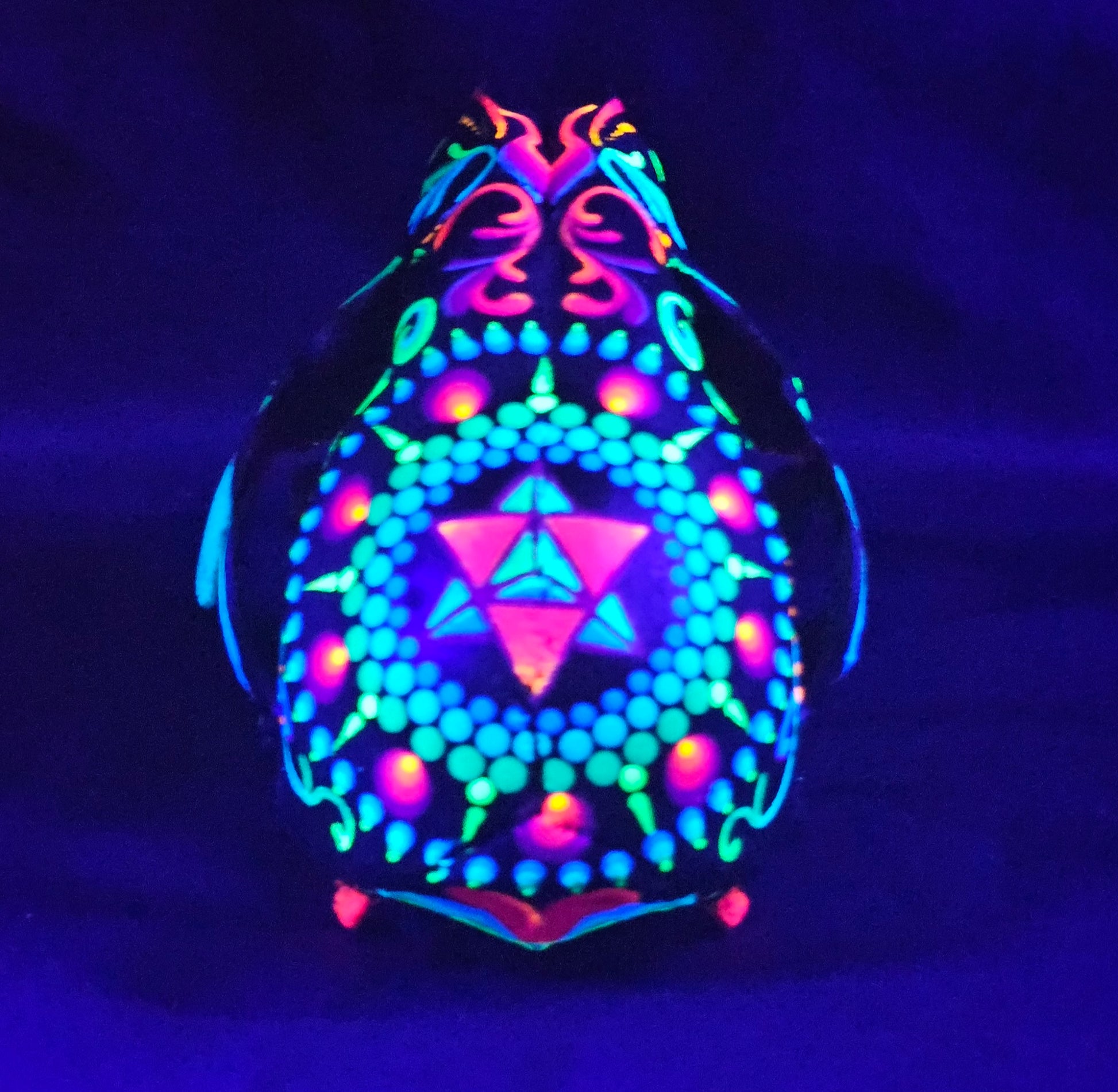 Materials: Authentic racoon skull skull, UV-reactive acrylics
